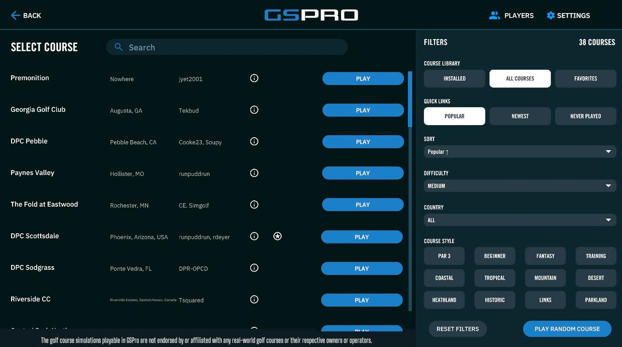 There are several filters to help you decide which course to play. Use them to filter down your choices or roll the dice and simply select the "PLAY RANDOM COURSE" and see where you end up!